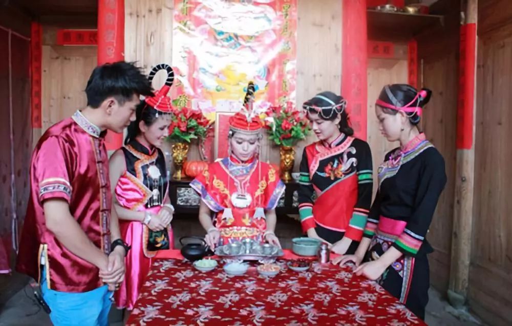 寶塔茶 畬族“寶塔茶”是福建福安畬族同胞在長期的生產生活中形成的一種獨具特色的婚嫁習俗。“寶塔茶”文化說的是,男方送來的禮品要一一擺在桌上展示。女方會取豬肉、禽蛋等過秤,男方一語雙關地問道:“親家嫂,有稱(有親)無?”親家嫂連聲答道:“有稱(有親)!有稱(有親)!”接著,女方用樟木紅漆八角茶盤捧出5碗熱茶,這5碗熱茶像疊羅漢式疊成3層:一碗墊底,中間3碗,圍成梅花狀,頂上再壓一碗,呈寶塔形,恭恭敬敬地獻給代表男方的“親家伯”品飲。親家伯品飲時用牙齒咬住寶塔頂上的那碗茶,以雙手挾住中間那3碗茶,連同底層的那碗茶,分別遞給4位轎夫,他自己則一口飲干咬著的那碗熱茶。這簡直是高難度的雜技表演!要是把茶水濺了或倒了,不但大伙無茶喝,還會遭到“親家嫂”的奚落。在獻茶時,通常還有一段對歌習俗。