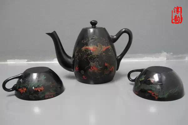 漆器茶具始于清代,主要產于福建福州一帶。福州生產的漆器茶具多姿多彩,有寶砂閃光、金絲瑪瑙、釉變金絲、仿古瓷、雕填、高雕和嵌白銀等品種。