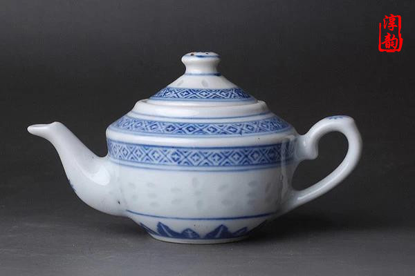 青花瓷茶具,其實是指以氧化鈷為呈色劑,在瓷胎上直接描繪圖案紋飾,再涂上一層透明釉,爾后在窯內經1300℃左右高溫還原燒制而成的器具。它的特點是:花紋藍白相映成趣,有賞心悅目之感;色彩淡雅幽菁可人,有華而不艷之力。加之彩料之上涂釉,顯得滋潤明亮,更平添了青花茶具的魅力。
