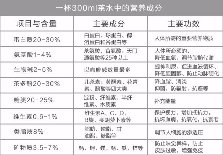 據(jù)科學家分析和鑒定,茶葉中含有300多種對人體有益的化學成分。其中包含大量的蛋白質(zhì)、氨基酸、脂肪、碳水化合物、礦物質(zhì)、微量元素以及維生素,其中維生素多達10余種,泡茶時多數(shù)可溶解在水中,能被充分利用。