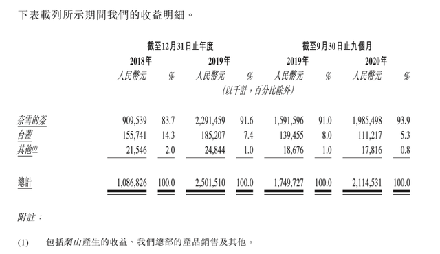 招股書顯示,2018年、2019年,奈雪的茶營業(yè)收入分別為9.1億元,22.91億元,2019年前三季度、2020年前三季度營收分別為15.92億元、19.85億元,2019年之后,該業(yè)務(wù)營收貢獻占營收總金額的比例提升至91%以上。