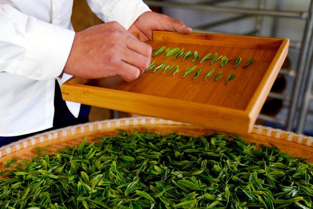 4月29日,在河北省臨城縣趙莊鄉(xiāng)桐花村,茶農(nóng)在查看茶葉品質(zhì)。