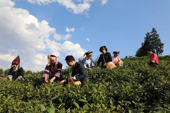 圖為普安縣稅務(wù)局干部積極服務(wù) “貴州綠茶”第一采活動(dòng),向茶農(nóng)宣傳惠農(nóng)稅收優(yōu)惠政策,并同布依族群眾采摘新年的第一茬綠茶。謝昌明 攝