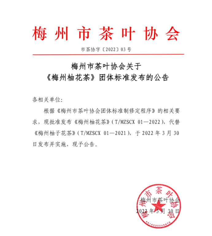 梅州市茶葉協(xié)會關(guān)于 《梅州柚花茶》團體標準發(fā)布的公告