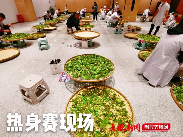 熱身賽現(xiàn)場,20余位身著白色大褂的行家里手細致地挑摘著鮮葉。為保證比賽公平,比賽使用的茶葉均是舉辦方統(tǒng)一提供的習水古樹茶。