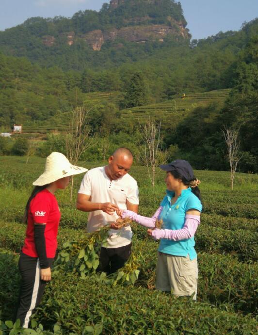 為探索茶園高效、生態(tài)、環(huán)保建設(shè)模式,福建農(nóng)林大學(xué)根系生物學(xué)研究中心主任廖紅與團隊走進星村鎮(zhèn),把高效豆科作物提高茶樹的養(yǎng)分利用效率,并達到減肥增效等科研成果,運用到茶葉基地建設(shè),以提高茶葉的產(chǎn)量及質(zhì)量。廖紅教授認為,茶豆套種作用明顯,大豆可產(chǎn)生根瘤菌,具有固氮作用,增加土壤肥力,茶園里套種大豆可少下或不下氮肥。同時,金龜子、蚜蟲等更喜歡大豆葉子,從而減少茶樹蟲害。還能增加茶葉產(chǎn)量,實驗表明,靠近大豆的茶樹每平方米可長出190個芽梢數(shù),比沒有靠近大豆的茶樹多出一倍。