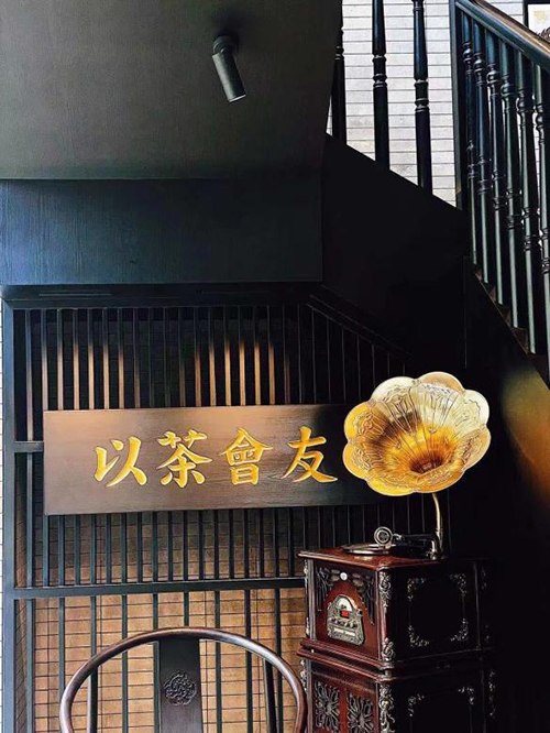 以茶會(huì)友的金字招牌上書“以茶會(huì)友”招徠過往賓客,配上傳統(tǒng)八仙桌與復(fù)古留聲機(jī)。在這個(gè)空間中喜茶靈感與廣式茶樓印象交融,傳統(tǒng)元素在打散重組中收獲新意。